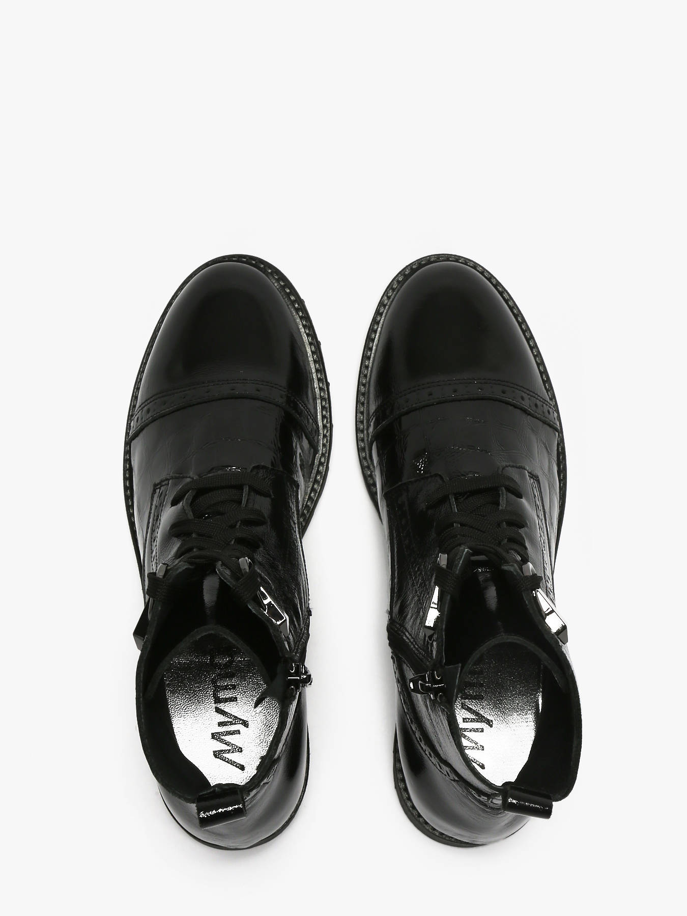 The black patent Croco ankle boots by MYMA combine boldness and sophistication. Crafted from patent leather with an elegant croco effect, they offer a polished, structured look. The mixed lace and zip closure ensures a perfect fit and easy wear, while the 3 cm ridged outsole provides comfort and stability. Fully leather-lined with a leather insole, they guarantee quality and durability. A chic, confident design, perfect for a modern urban style.