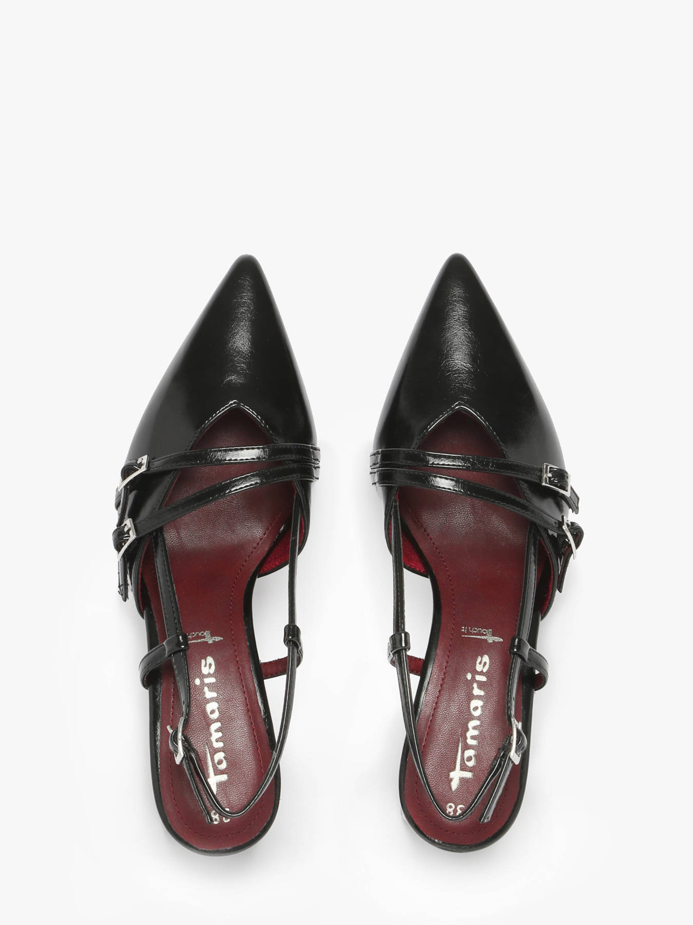 Make your personality shine during special occasions with these elegant Tamaris slingbacks, available in black and merlot patent. Their 6.5 cm heel, combined with Antislide and Antishokk technologies, ensures a safe and comfortable stride even during long evenings. The pointed silhouette and delicate buckle strap offer a timeless glamorous style, perfect for weddings, cocktails, or sophisticated events. Express your individuality and radiate confidence with every step, being fully yourselves. These shoes combine elegance and comfort, allowing you to shine with style and assurance while enjoying every moment to the fullest.