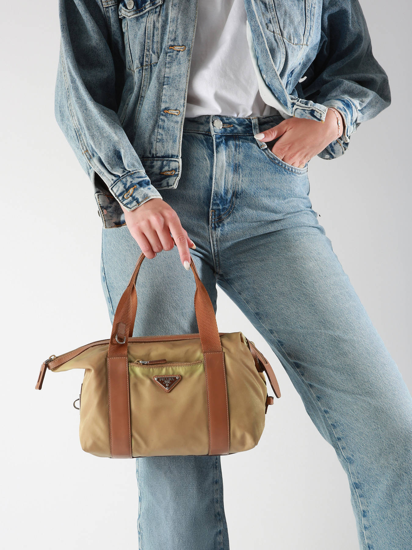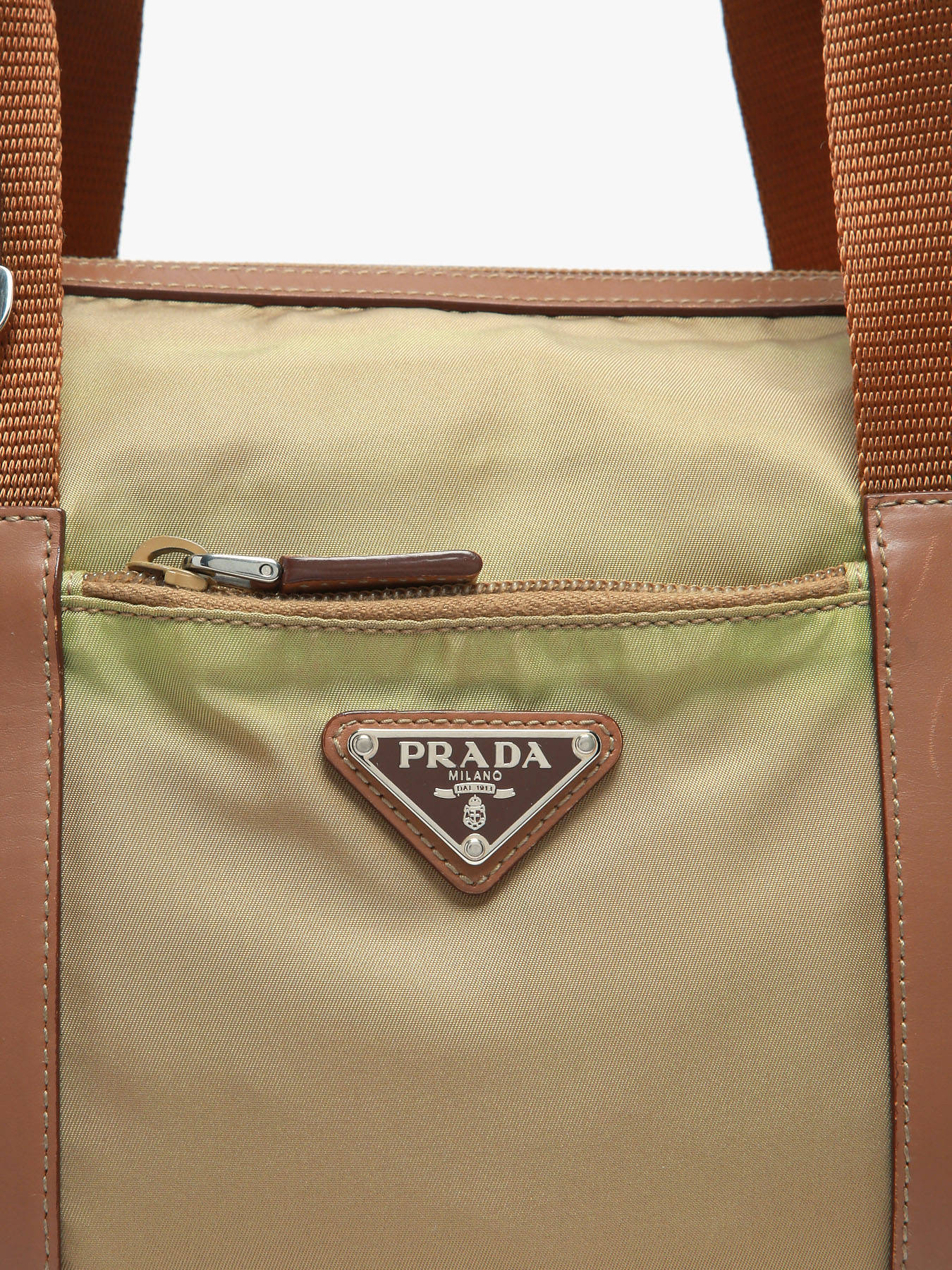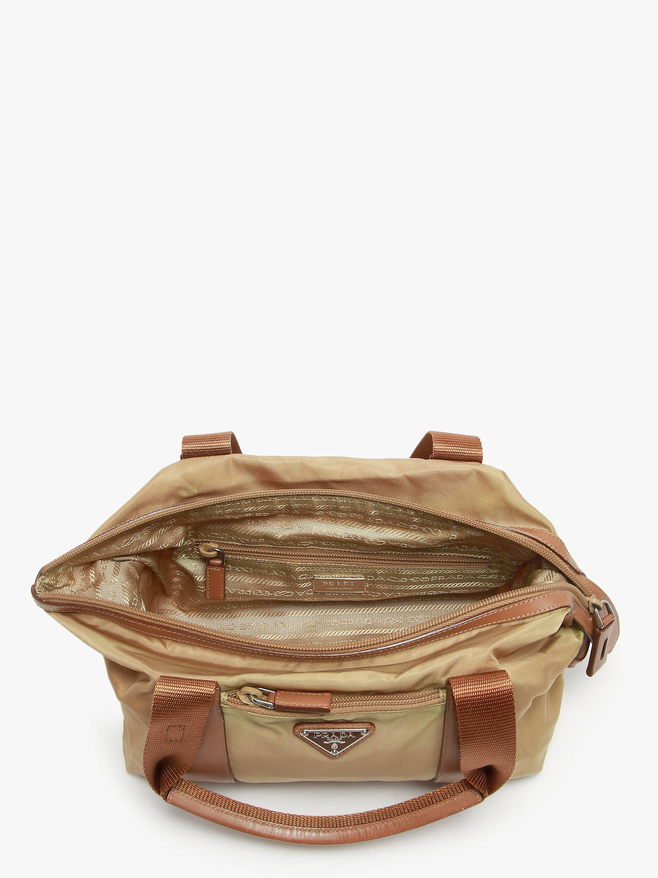 PRADA Tessuto handbag in nylon with leather trim, an iconic and practical design. It features a zip closure, a 19 cm handle for comfortable hand carry, and a front zipped pocket. The interior includes one main compartment and one zipped pocket, perfect for keeping your belongings organized. This Grade AB bag is in very good condition, showing light signs of wear.