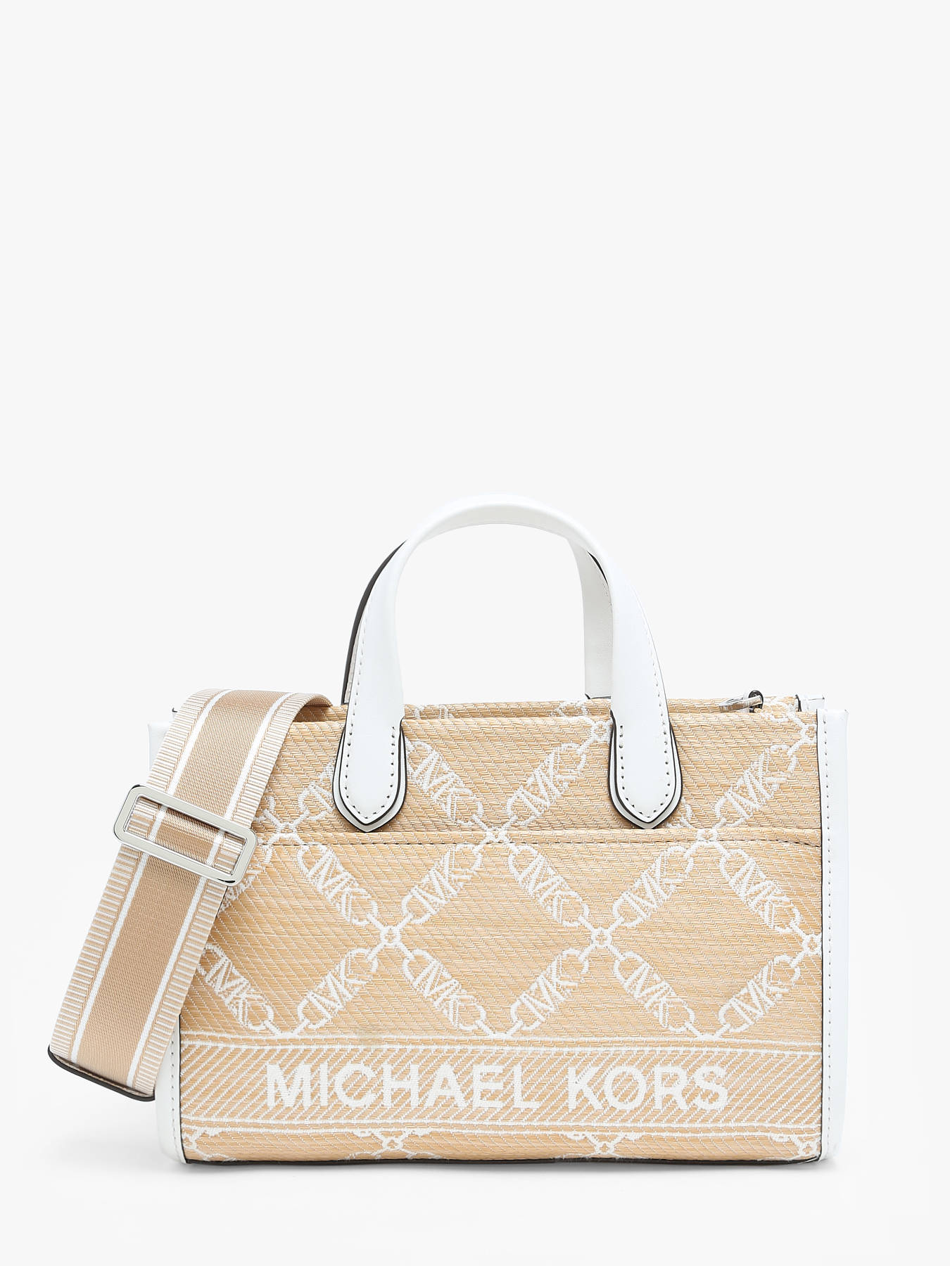 The MICHAEL KORS handbag is the perfect accessory for those seeking both style and functionality. Made from raffia trimmed with leather, this bag offers a unique combination of sophistication and casualness. Featuring a front pocket, two simple pockets, and one zippered pocket, it provides a variety of storage options for your small essentials. The zippered closure ensures the security of your personal belongings, while the 11 cm handle height allows for comfortable hand carrying. Additionally, the adjustable and removable shoulder strap offers you the flexibility to wear this bag in different ways to suit your needs and style. With a single spacious compartment, it offers enough space to organize your belongings with ease. Whether for a day at the office or a casual outing in the city, this MICHAEL KORS handbag will perfectly complement your outfit with elegance and practicality.