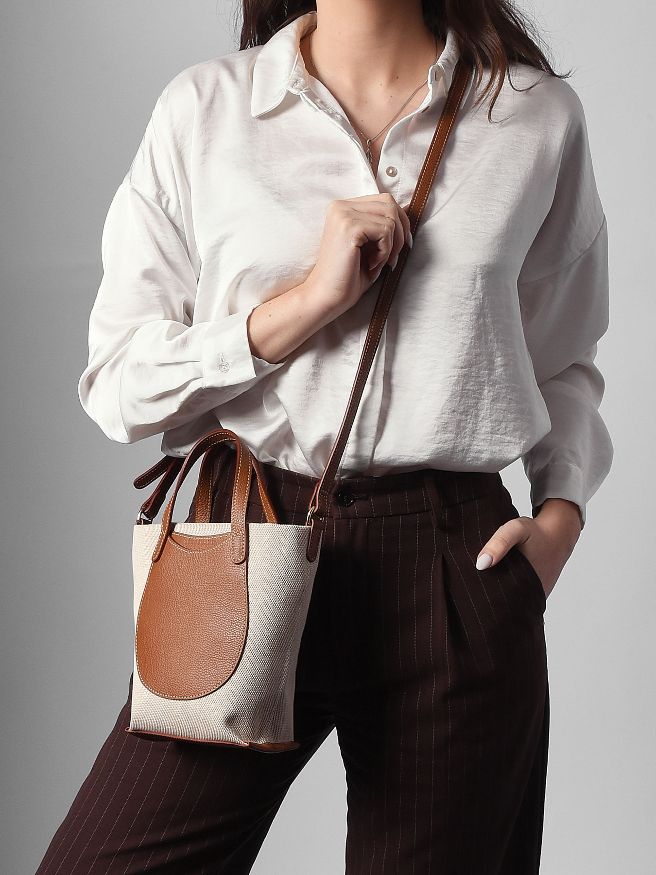 The Complice shoulder bag by LONGCHAMP combines femininity, elegance, and great versatility. This mini tote from the Complice line perfectly blends casualness with refinement for everyday use. Made from heathered cotton canvas, it is enhanced with grained cowhide leather finishes that offer both softness and structure. It features high handles for hand carrying and an adjustable buckle strap for shoulder or crossbody wear. A small exterior leather pouch completes the design, providing easy access to essentials. Inside, it has a single compartment with a practical patch pocket, while the reinforced base ensures sturdiness and long-lasting durability. With a handle height of 9 cm, this bag represents the perfect balance of style, craftsmanship, and functionality.