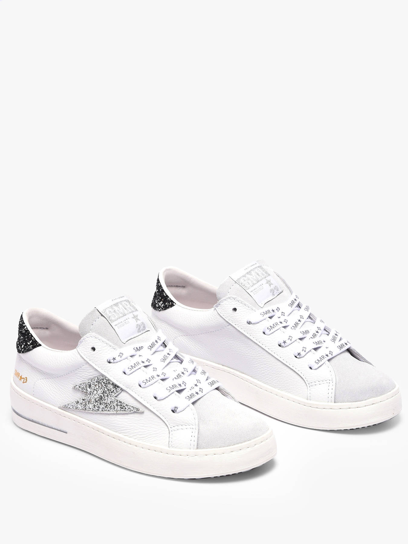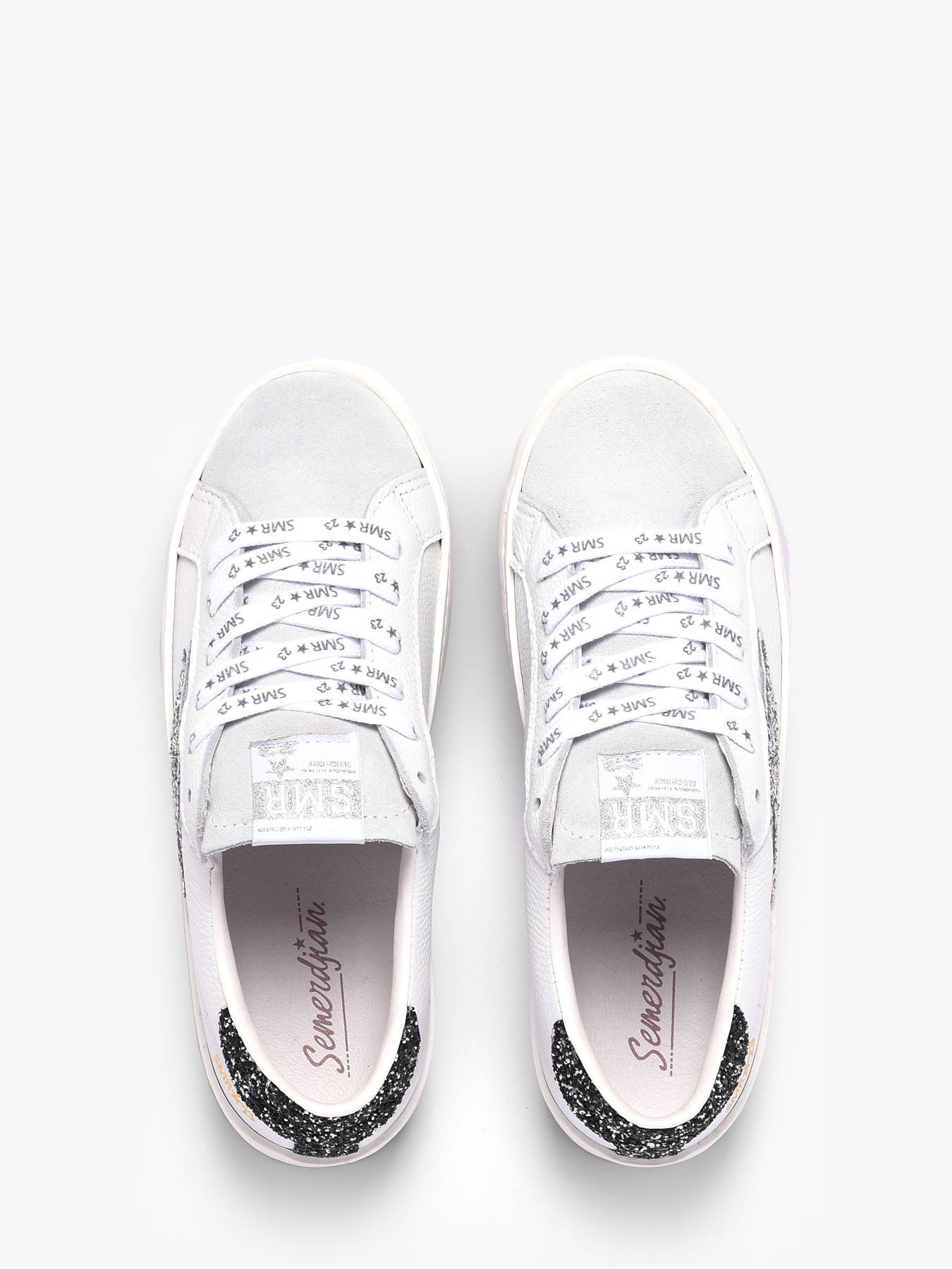 The Maya sneakers from Semerdjian reinvent the classic white sneaker with a touch of sparkle for a chic, everyday urban look. Their timeless white leather base provides comfort and durability, while the black glitter heel counter adds contrast and modernity. The signature silver glitter lightning bolt brings subtle, dynamic shine to every step, making these sneakers elegant and instantly recognizable. Versatile and stylish, they are perfect for city wear or outings, offering comfort, support, and a refined design that turns heads. The Maya perfectly embodies Semerdjian’s blend of sophistication and modernity.